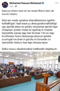 Xildhibaan Maxamed Xasan ayaa sidoo kale sheegay inaysan suurtagal ahayn in maanta la yiraahdo golaha waa la sii furi doonaa, iyadoo lagu sababeeyay in Dastuurka laga shaqeynayo, xilli uu horey u dhammaaday fasaxii dastuuriga ahaa ee Golaha.