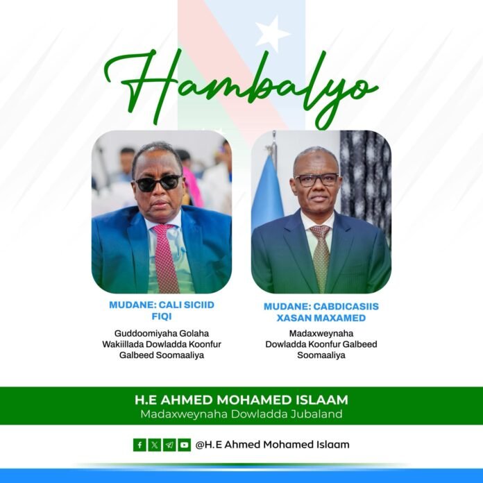 Madaxweynaha maamulka Jubbaland Axmed Maxamed Islaam, ayaa dhambaal hambalyo ah u diray Madaxweynaha la doortay ee Koofur Galbeed, Cabdicasiis Xasan Maxamed, iyo Guddoomiyaha Golaha Wakiillada Mudane Cali Siciid Fiqi.