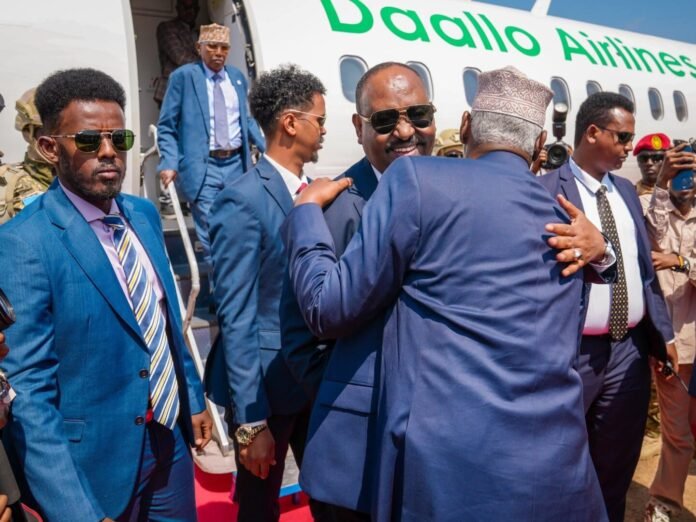 Madaxweyne Deni oo watay ciidamo ilaalo ah oo hubaysan, waxaa garoonka diyaaradaha Kismaayo ku soo dhaweeyay mas’uuliyiin uu horkayay madaxweynaha Jubaland Axmed Madoobe.