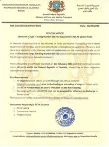 Dowladda Federaalka Soomaaliya, gaar ahaan Wasaaradda Dekedaha iyo Gaadiidka Badda, ayaa soo saartay amar ku socda dhammaan maraakiibta iyo gaadiidka kale ee soo galaya Badda Soomaaliya, kaasi oo la xiriira fulinta nidaamka cusub ee ECTN (Electronic Cargo Tracking Note).