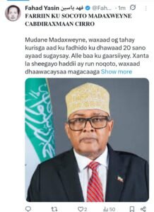 Fahad Yaasiin, Agaasimihii hore ee Ha’ayada Nabadsugida iyo Sirdoonka qaranka Soomaaliya ee NISA ayaa fariintan u direy Madaxweynaha Somaliland Cabdiraxmaan Ciro.