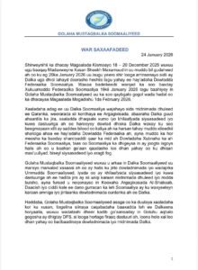 Golaha Mustaqbalka Soomaaliyeed, oo ay ku mideysan yihiin maamullada Puntland, Jubbaland iyo siyaasiyiinta mucaaradka ah, ayaa soo saaray war saxaafadeed ay ku muujinayaan mowqifkooda ku aaddan casuumadda shirka wada-hadalka Qaran ee ay Dowladda Federaalka Soomaaliya u fidisay, kaasoo la filayo inuu ka furmo Muqdisho 1-da Febraayo 2026., balse waxay shuruudo ku xireen ka qeyb galka shirkaasi.