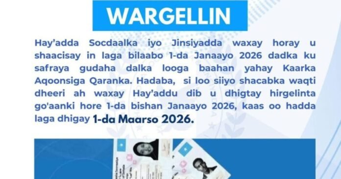 War kasoo baxay Hay’adda Socdaalka iyo Jinsiyadda ayaa lagu sheegay in go’aankaasi oo horey loogu qorsheeyay inuu dhaqan galo 1-da Janaayo 2026, dib loo dhigay, isla markaana uu dhaqan geli doono 1-da Maarso 2026, si shacabka Soomaaliyeed loo siiyo waqti dheeri ah oo ay ku diyaarsadaan qaadashada Kaarka Aqoonsiga Qaranka.