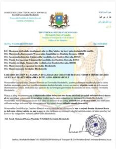 hoos ka akhriso qoraal kasoo baxay wasaaradda gaadiidka maamulka Hirshabeelle.