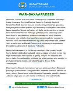 Jubaland waxay sheegtay in heshiisyada la xiriira horumarinta, ganacsiga iyo amniga ay ka mid yihiin awoodaha ay Dastuur ahaan u leedahay, sidaas darteedna aysan Dowladda Federaalka xaq u lahayn inay baabi’iso ama wax ka beddesho.