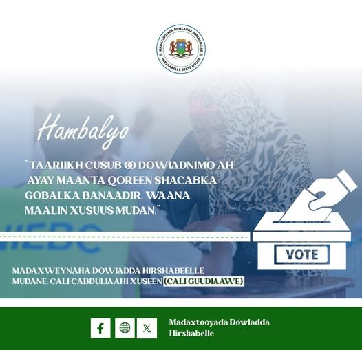 Madaxweynaha Dowladda Hirshabeelle, Mudane Cali Cabdullaahi Xuseen (Cali Guudlaawe), ayaa hambalyo iyo bogaadin u diray Madaxweynaha Jamhuuriyadda Federaalka Soomaaliya Mudane Xasan Sheekh Maxamuud, Guddiga Madaxa-bannaan ee Doorashooyinka Qaranka, Maamulka Gobolka Banaadir, iyo guud ahaan shacabka Gobalka Benaadir, isagoo bogaadiyay guusha laga gaaray yoolka muddada dheer la higsanayay.