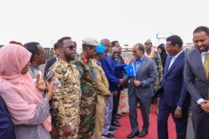 Madaxweynaha Jamhuuriyadda Federaalka Soomaaliya, Mudane Xasan Sheekh Maxamuud, oo ay wehelinayaan wasiirro ka tirsan Xukuumadda Federaalka ah iyo saraakiisha Ciidamada Qalabka Sida ayaa soo gaaray magaalada Dhuusamareeb, xarunta dowlad-goboleedka Galmudug.