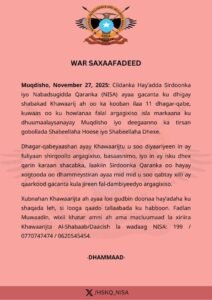 “Hay’adda Sirdoonka iyo Nabadsugidda Qaranka waxay mar kale xaqiijinaysaa inay sii wadi doonto dadaallada ay ku baacsaneyso maleeshiyaadka Al-Shabaab, si loo sugo amniga dalka iyo badbaadada shacabka Soomaaliyeed.” ayay sii raacisay warkeeda.