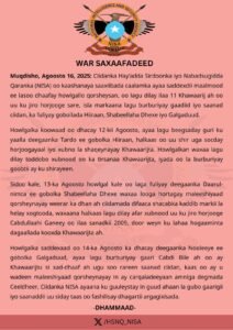 Ciidanka Hay’adda Sirdoonka iyo Nabadsugidda Qaranka (NISA) oo kaashanaya saaxiibada caalamka ayaa saddexdii maalmood ee lasoo dhaafay fuliyay howlgallo qorsheysan oo guul weyn laga gaaray, kuwaas oo ka dhacay gobollada Hiiraan, Shabeellada Dhexe iyo Galgaduud, laguna dilay ugu yaraan 11 xubnood oo ka tirsan Khawaarijta, oo ay ku jiraan horjoogayaal sare, halka sidoo kale lagu burburiyay gaadiid dagaal iyo saanad ciidan oo ay kooxdaasi adeegsanaysay.