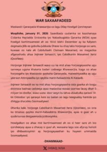 Saaxiibada caalamka oo kaashanaya Ciidanka Hay’adda Sirdoonka iyo Nabadsugidda Qaranka (NISA) ayaa howlgal bartilmaameed ah oo 10-kii bishii December ay ka fuliyeen degmada Jilib ee gobolka Jubbada Dhexe ku dilay labo horjooge oo sare, kuwaas oo kala ah Cabdullaahi Cismaan Maxamed, oo magaciisa afgarashadu ahaa Injineer Ismaaciil, iyo Cabdikariin Maxamed Xersi (Qoorleex), sida lagu sheegay Warsaxaafadeedka ka soo baxay Taliska NISA.