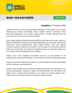 Xisbiga Himilo Qaran ee uu hogaamiyo Madaxweynihii hore ee Somalia Shariif shiikh Axmed ayaa soo saaray war-saxaafadeed uu kaga hadlayo tallaabooyin uu qaaday Madaxweynaha Koonfur Galbeed, Cabdicasiis Xasan Maxamed (Laftagareen), oo la xiriira magacaabista guddiga madaxbannaan ee xuduudaha iyo doorashooyinka maamulkaas.