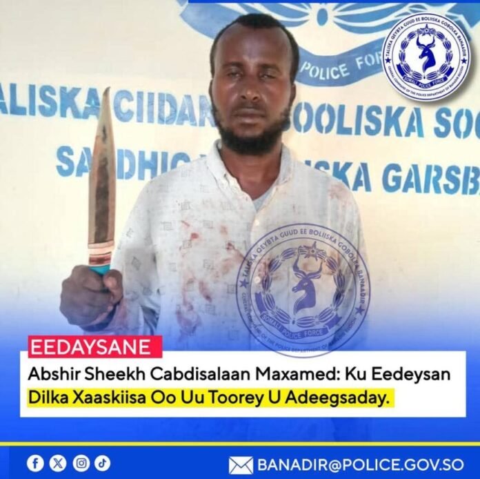 Ciidanka Booliska Soomaaliyeed ee Saldhigga Garasbaaley ayaa gacanta kusoo dhigay eedeysane lagu magacaabo Abshir Sheekh Cabdisalaan Maxamed, kaas oo lagu eedeeyay inuu xaaskiisa ku dilay toorey.