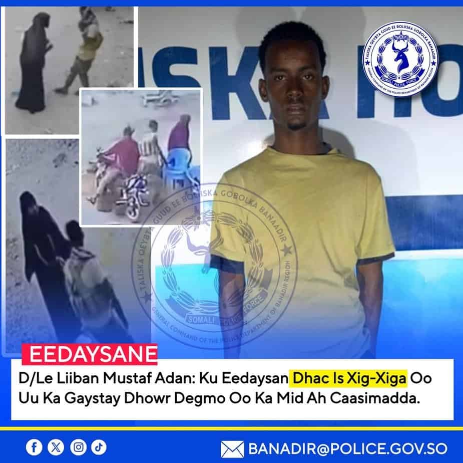 Qoraal ka soo baxay Booliiska ayaa lagu sheegay in ciidanku ay soo xireen eedaysane D/le Liiban Mustaf Aadan, kaas oo ku eedeysan falal dhac isdaba joog ah oo uu ka geystay dhowr degmo oo ka mid ah Muqdisho.
