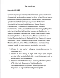 War-murtiyeed ayaa laga soo saaray shirar ay madaxtooyada ku yeesheen Madaxweynaha Soomaaliya Xasan Sheekh Maxamuud, guddiga Dowladda Federaalka Soomaaliya ee wadahadalada iyo qaar kamid ah Xubnaha Mucaaradka oo kala ah Mursal Sheekh iyo Shariif Xasan Sheekh Aadan oo hore u soo noqday Guddoomiyeyaashii hore ee Baarlamaanka Soomaaliya, Cumar Cabdirashiid Cali Sharmaarke, Ra’iisul Wasaarihii hore ee Soomaaliya, Daahir Maxamuud Geelle Wasiir hore, wasiirkii hore ee warfaafinta Soomaaliya.