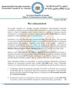 Wasaaradda Awqaafta iyo Arrimaha Islaamka Xukuumada Jamhuuriyadda Federaalka Soomaaliya oo gudaneysa waajibaadkeeda Qaran, kana duuleysa qorshe howleedka arrimaha