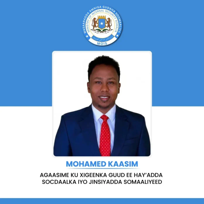 Wasiirka Wasaaradda Amniga Gudaha ee Xukuumadda Federaalka Soomaaliya, Mudane Cabdullaahi Sheekh Ismaaciil (Fartaag), ayaa maanta si rasmi ah ugu magacaabay Mudane Maxamed Kaasim inuu noqdo Agaasimaha Ku-Xigeenka Guud ee Hay’adda Socdaalka iyo Jinsiyadda Soomaaliyeed.