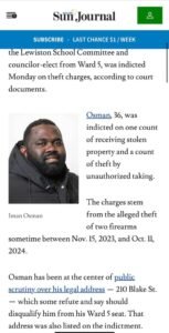 Iman Osman, oo 36 jir ah, isla markaana ah xubin hore uga tirsanaa Guddiga Dugsiyada Lewiston iyo sidoo kale golaha deegaanka ee Ward 5, ayaa Isniintii lagu soo oogay laba dacwadood—mid ku saabsan helista hanti la xaday iyo mid ku saabsan xatooyo aan la oggolayn.